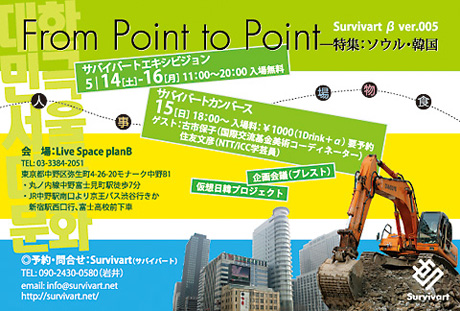 2004)を主催された、国際交流基金の古市保子氏(美術コーディネーター)と、キュレーションを担当された住友文彦氏(ICC学芸員/AIT副ディレクター)をお招きし、前半は展覧会の紹介から現場の舞台裏までそれぞれの役割からお話いただき、後半は「プロジェクト企画会議」と題して、サバイバートによる仮想日韓プロジェクトのプレゼンテーションを元に、参加者を交えてのブレストを行いたいと思います。